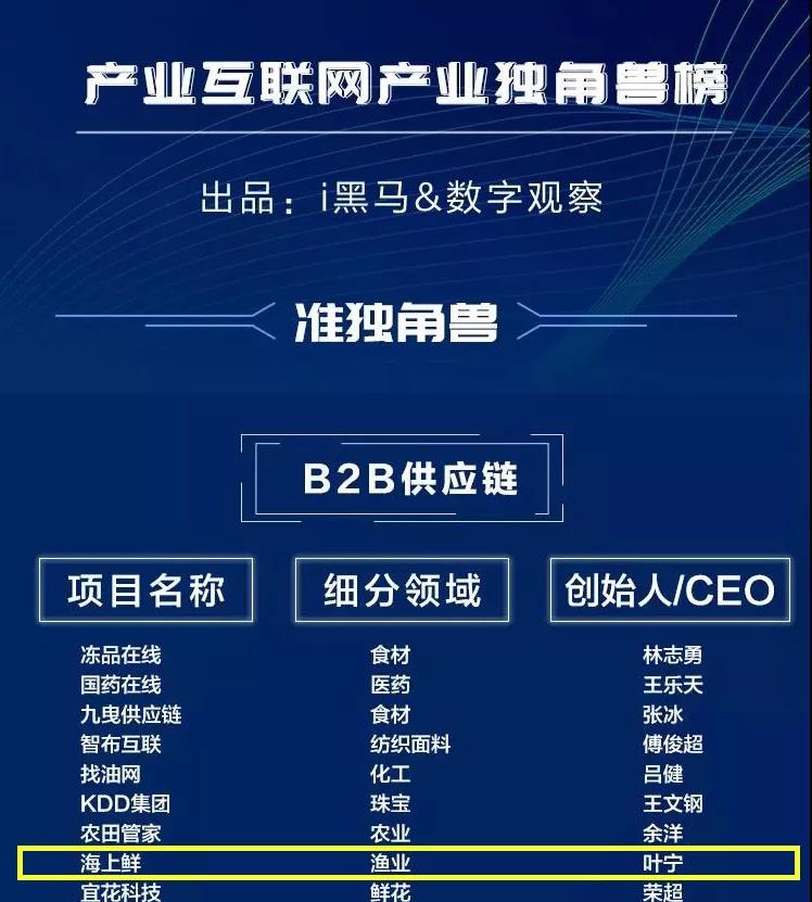 事实上,海上鲜公司入围独角兽企业榜单已不是第一次。去年,在北京举行的“2018独角兽峰会”,会上,i黑马正式发布“2018中国准独角兽TOP50夏榜”,海上鲜公司成功入围企业级服务行业,成为该行业的准独角兽。