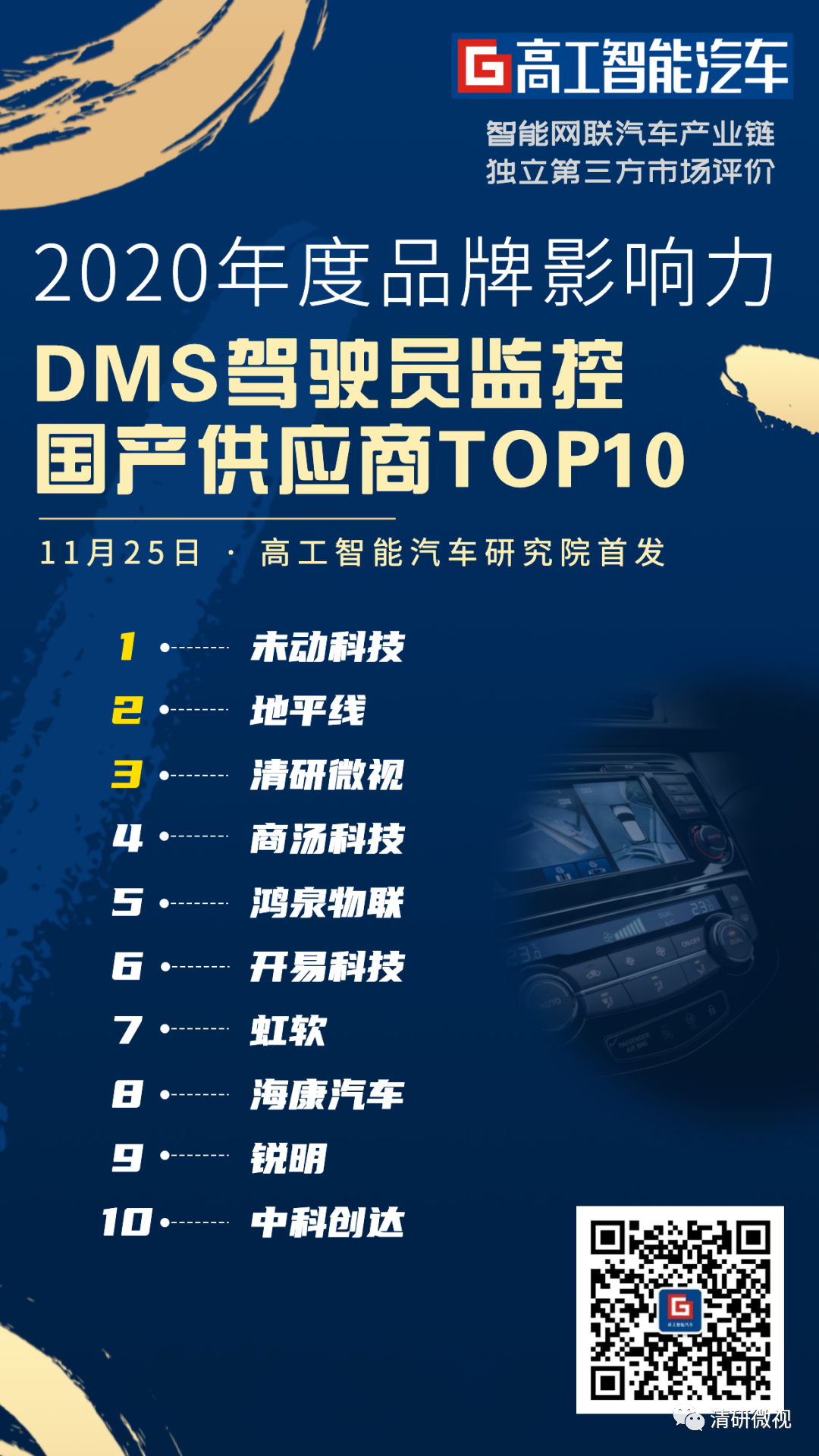 11月25日,高工智能汽车研究院基于视觉DMS解决方案(包括软件感知算法或系统)供应商技术储备、差异化优势、在中国市场的前后装量产项目进程以及市场曝光度等因素,首次综合发布年度供应商品牌影响力TOP10企业榜单,清研微视荣登排行榜TOP3。