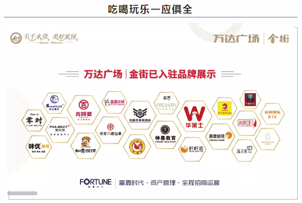 ? ? ? ? 万达广场|金街由富鑫时代商管公司统一经营管理,规划各种商业业态,各种知名品牌商家集结于此,部分商铺自带品牌租约,融合餐饮、娱乐、休闲、购物、教育等多业态经营。