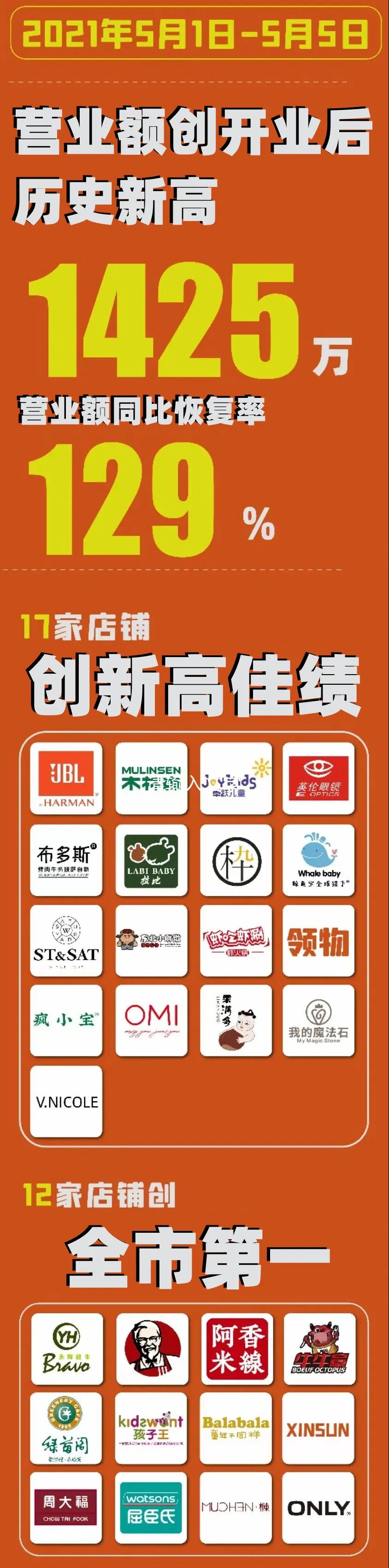 5月1日—5日,随州万达广场及金街,营业额创开业后历史新高1425万、营业额同比恢复率129%,17家店铺创新高佳绩,12家店铺创全市第一!