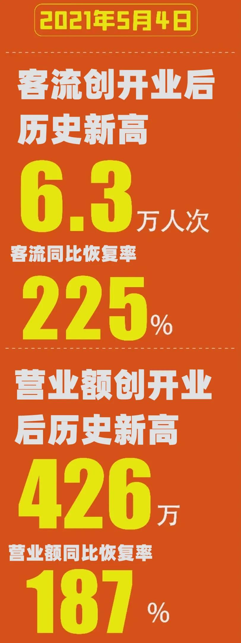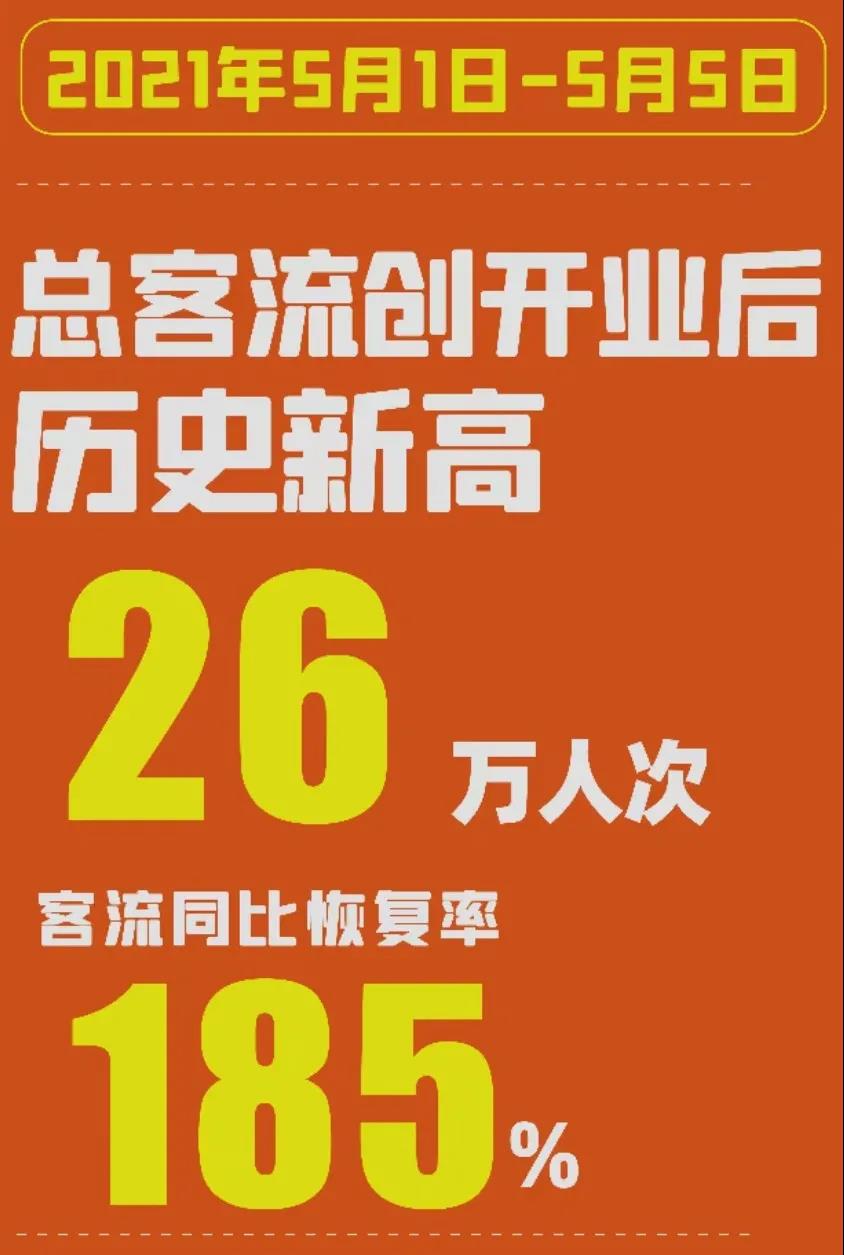 5月1日—5日,随州万达广场及金街,总客流创开业后历史新高26万人次、客流同比恢复率185%;仅5月4日,客流创开业后历史新高6.3万人次、客流同比恢复率225%,营业额创开业后历史新高426万、营业额同比恢复率187%!