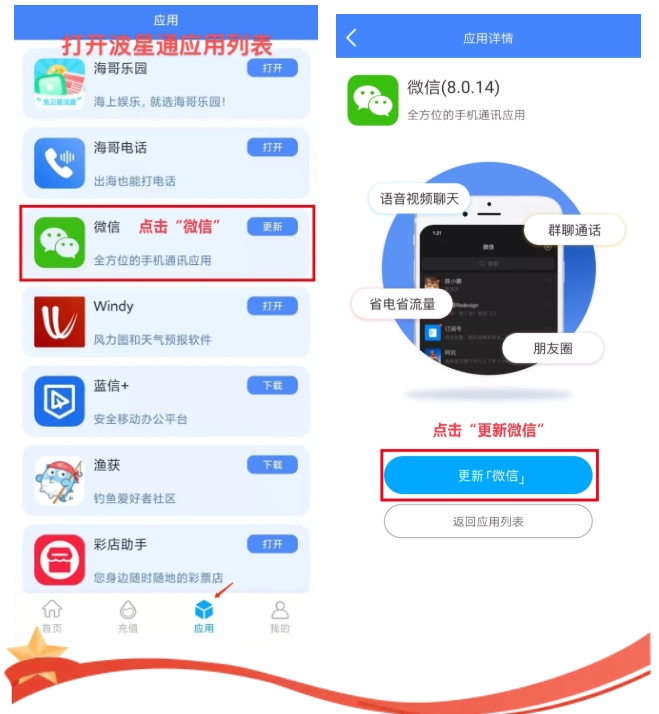 微信已发布最新版本8.0.14,请前往波星通app内应用列表升级微信,升级过程不消耗卫星流量。(若微信自动更新则有跑流量的风险)