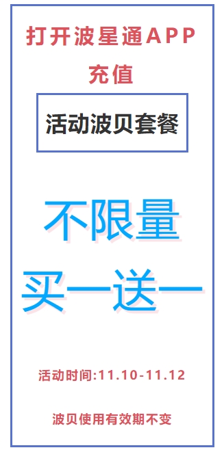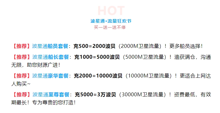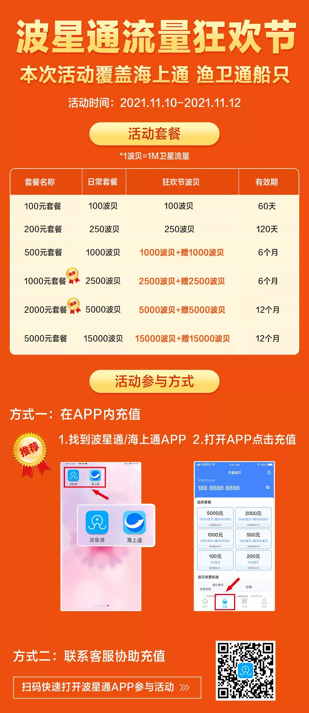 购买方式:活动期间(11月10日-11月12日)打开波星通/海上通APP-充值,即可选择所需套餐!多买多送,限时流量狂欢!