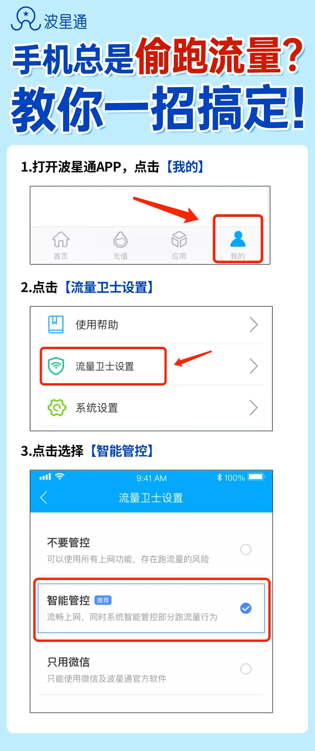 针对这种情况,波星通APP的流量管控系统能很好的协助您解决,防止流量出现无意义的偷跑,只需在波星通APP两次点击就能实现!