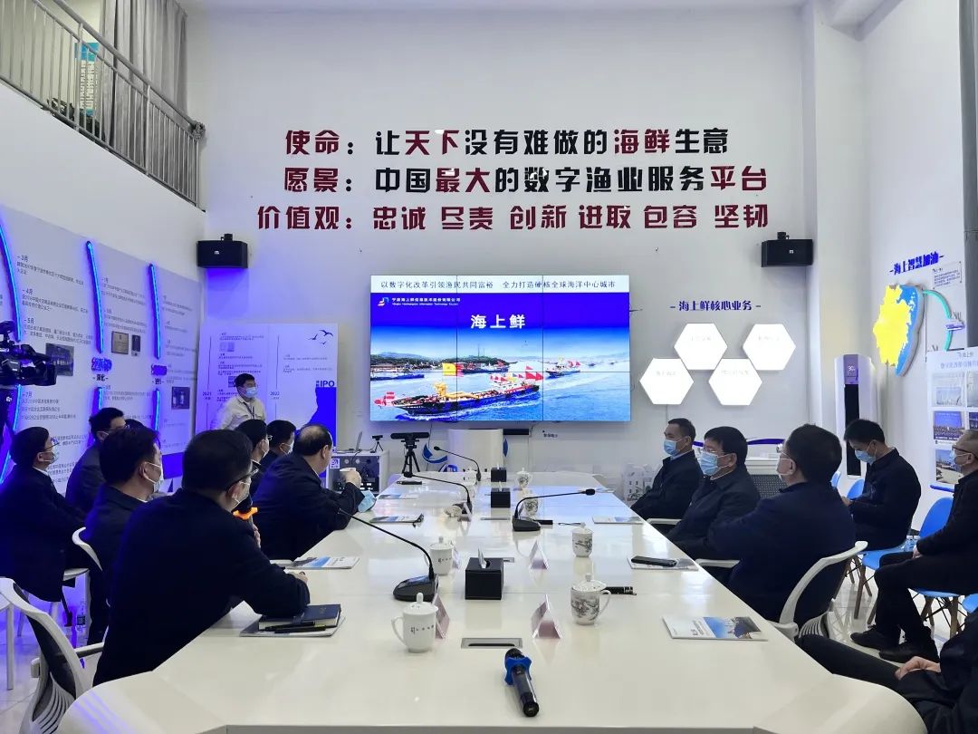 会上,海上鲜董事长叶宁对黄书记等各位领导的到来表示热烈欢迎,就公司的发展情况、团队建设和未来规划作了详细介绍,并重点汇报了企业在“数字化改革”号召下的主要工作成绩。海上鲜致力于用数字化赋能海洋渔业产业转型升级,通过7年的摸索、创新和深耕,现已成功打造集海上通信服务、海鲜交易服务、供应链服务、海上智慧加油服务四大板块为一体的一站式数字渔业综合服务平台,并与政府联动共同推出“浙里惠渔”项目——“星上渔业监管”,“掌上政务服务”、“海上商务服务”和“岸上后服拓展”四大场景,该项目也成功入选浙江省农业农村厅“先行先试”、宁波市数字化改革最佳应用等,目前已在浙里办上线应用。在发展海洋经济数字化转型工作中,公司紧跟国家“一带一路”、“东西部扶贫”的号召,比如在吉林珲春的产业合作项目入选国务院扶贫办典型案例,正在建设的珲春海洋经济国际产业园预计明年投入运营,将珲春打造为西北太平洋海产品交易的中心。同时也不忘“走出去”,依托福州、厦门、北海、防城港等口岸积极与印尼、马来西亚等东盟以及一带一路上的国家加强海产品经贸合作,弥补国内海产品资源的紧缺。