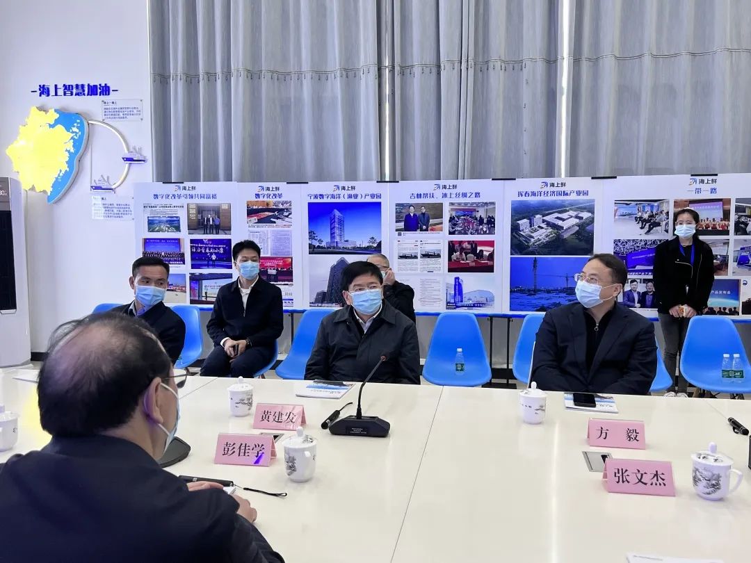 2022年3月23日下午,浙江省委副书记、统战部部长黄建发一行领导莅临海上鲜调研指导,浙江省委常委、宁波市委书记彭佳学陪同调研。本次来访旨在听取海上鲜在“浙里惠渔”多跨应用场景项目、渔船安全监管、海洋经济数字化转型发展中的主要工作情况,浙江省委办公厅副主任方毅,省住房和城乡建设厅副厅长孙哲君,省农业农村厅党组副书记、副厅长陈利江;宁波市委副书记、政法委书记钟关华,市委常委、秘书长、副市长张文杰;奉化区委书记胡永光等领导出席了本次会议。