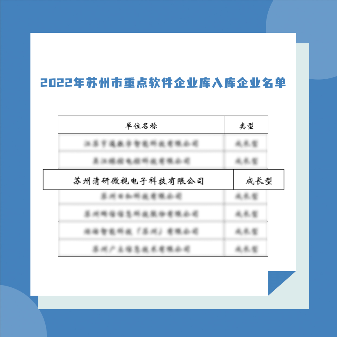 近日,苏州市工信局公布了“2022年苏州市重点软件企业库入库企业名单”,苏州清研微视电子科技有限公司(以下简称“清研微视”)依托在软件和信息服务业方面的技术创新、应用融合等方面的突出优势成功入选。